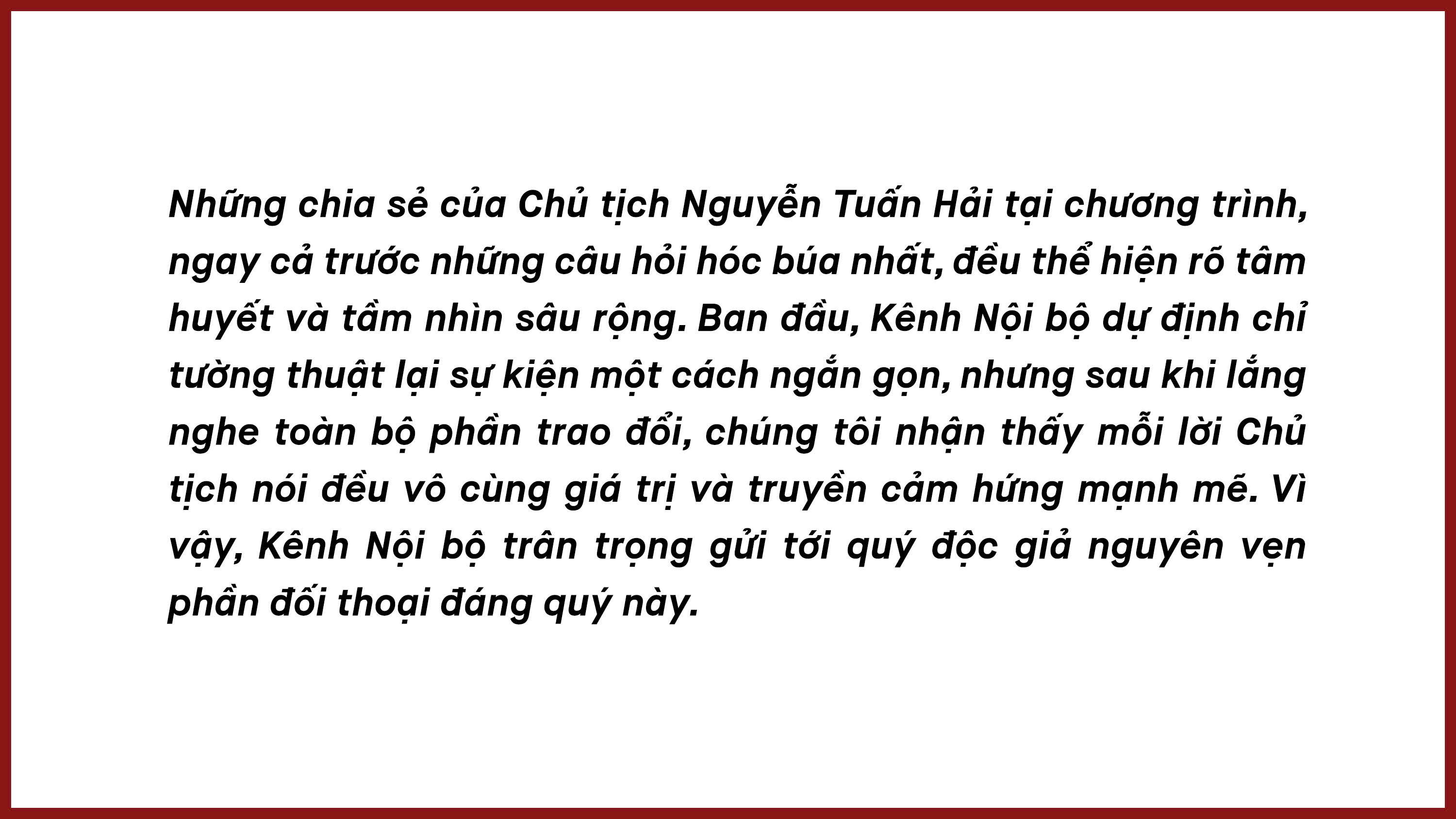 Chủ tịch Nguyễn Tuấn Hải mở đầu chương trình với lời nhắn gửi chân tình. Ông nhấn mạnh rằng "chuyển giao" không chỉ là một giai đoạn tất yếu mà còn là một phần quan trọng trong chiến lược cuộc đời mình, đồng thời là thước đo chân thực cho sự thành công và trường tồn của một doanh nghiệp. Chủ tịch chia sẻ rằng ngay từ độ tuổi 35 - 40, ông đã bắt đầu trăn trở về vấn đề này và dành thời gian tìm hiểu sâu về mô hình các công ty đã vững bền hàng trăm năm trên thế giới. Với bề dày kinh nghiệm thực tiễn đúc kết từ hành trình của mình, Chủ tịch Nguyễn Tuấn Hải đã sẵn lòng sẻ chia những bài học quý giá, mở ra những góc nhìn đa chiều cho thế hệ doanh nhân trẻ.