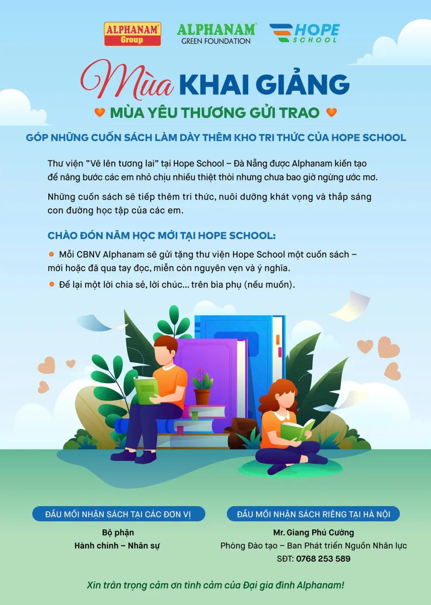 - Mỗi CBNV Alphanam trên khắp cả nước cùng gửi tặng thư viện của Hope School một cuốn sách, có thể là sách, truyện mới hoặc đã qua tay đọc, miễn còn nguyên vẹn giá trị.