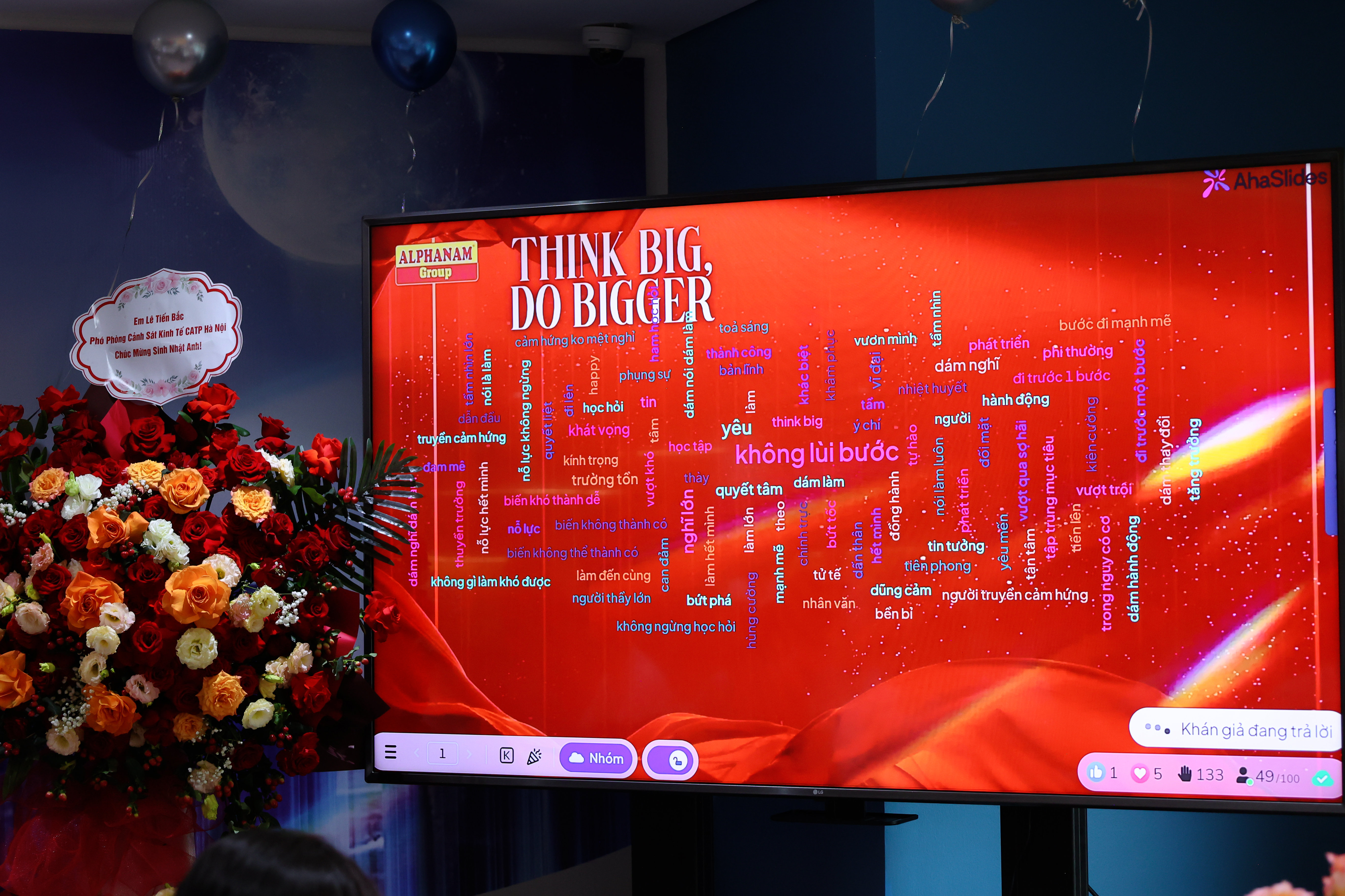 Đó là 3 trong số 60 lời chúc mà Ban Tổ chức đã nhận được từ các thành viên Alphanam muốn gửi đến Chủ tịch. Trùng hợp thay, 3 lời chúc này đều nói lên phẩm chất của Chủ tịch Nguyễn Tuấn Hải: Người sẵn sàng nghĩ lớn, làm càng phải lớn hơn. Đúng như lời Chủ tịch đã nói, mỗi thành viên Alphanam sẽ tiếp bước ông, cùng nhau "think big - do bigger" cho tương lai.